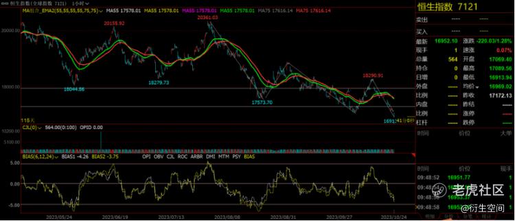 从技术面的角度看,恒指一小时马上就进入超跌区间了,BIAS进入极值5左右,正所谓物极必反,有反弹的信号。