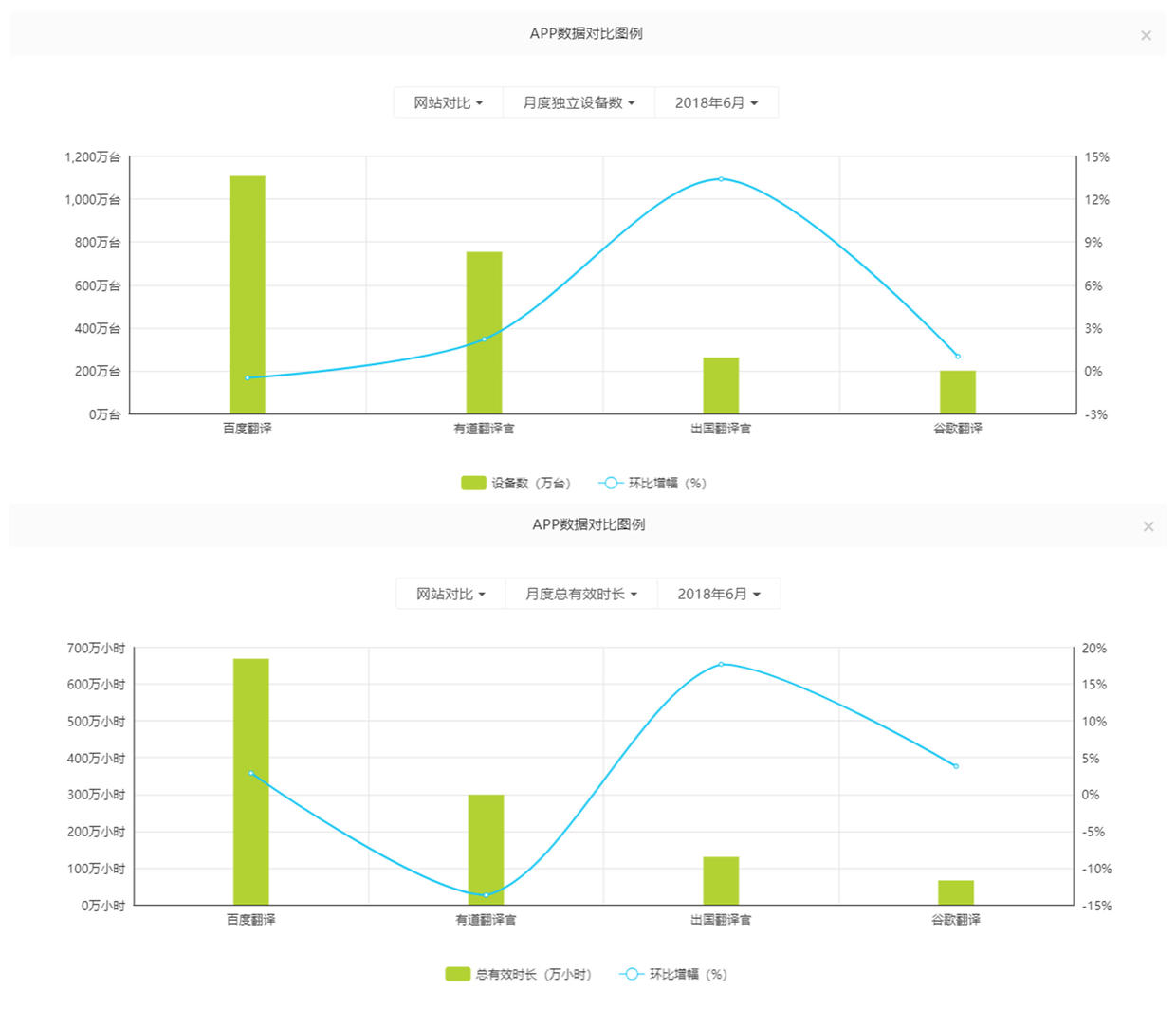 当时此事还在圈内引起了一阵小骚动,各大媒体纷纷报道。但是与这些形成反差的是,艾瑞App指数显示,无论在阅读独立设备数,还是月度总有效时长指标上,谷歌翻译都远远敌不过百度翻译和有道翻译官。比如今年6月份,百度翻译的阅读独立设备数为1108万台,而谷歌翻译仅为200万台。