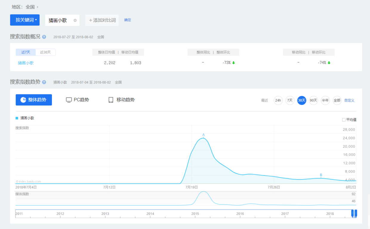 猜画小歌也是如此,7月18日上线之后,在用户口口相传之下热度暴涨,不少评论表示,“谷歌就是谷歌,一出手就刷屏”。百度指数显示,7月20日,“猜画小歌”关键词搜索指数达到了巅峰值21950,但随后便开始一路下坡,至8月2日仅剩1547。