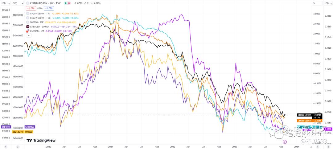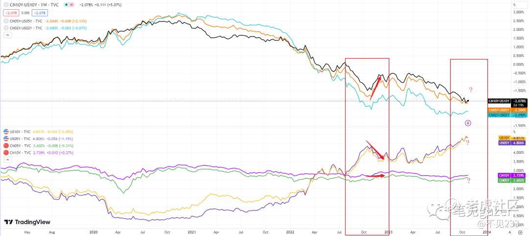 右轴:人民币汇率-紫线;中美利差(不同期限)-黑橙蓝线;