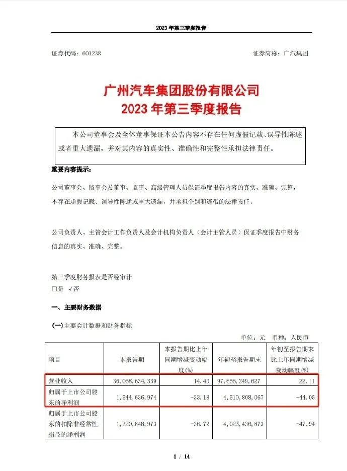 5.广汽集团 Q3 净利润 15.45亿,同比下降 33.18%
