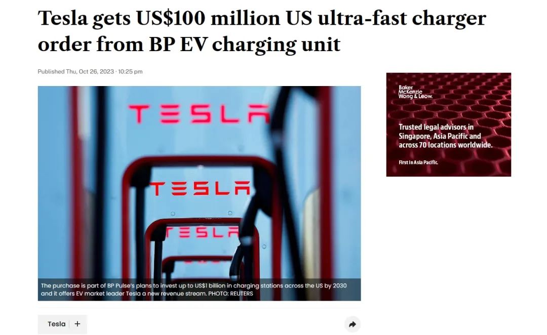 英国石油公司相关部门表示,将订购价值 1 亿美元的特斯拉超充桩,并在美国各地部署。