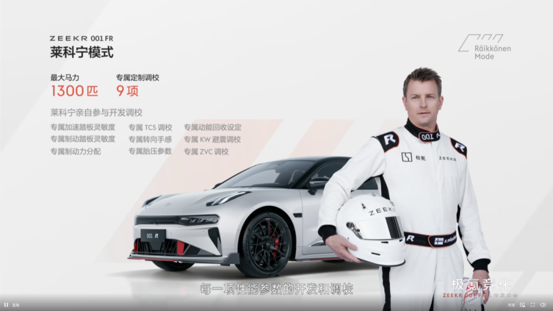 除了已知配置外,发布会现场安聪慧还透露了极氪 001 FR 上特调的莱科宁模式,由 Kimi 亲自调校开发。该模式新增 9 项专属调校,包括专属的加速踏板灵敏度、转向手感、KW 避震调校、制动力分配等。