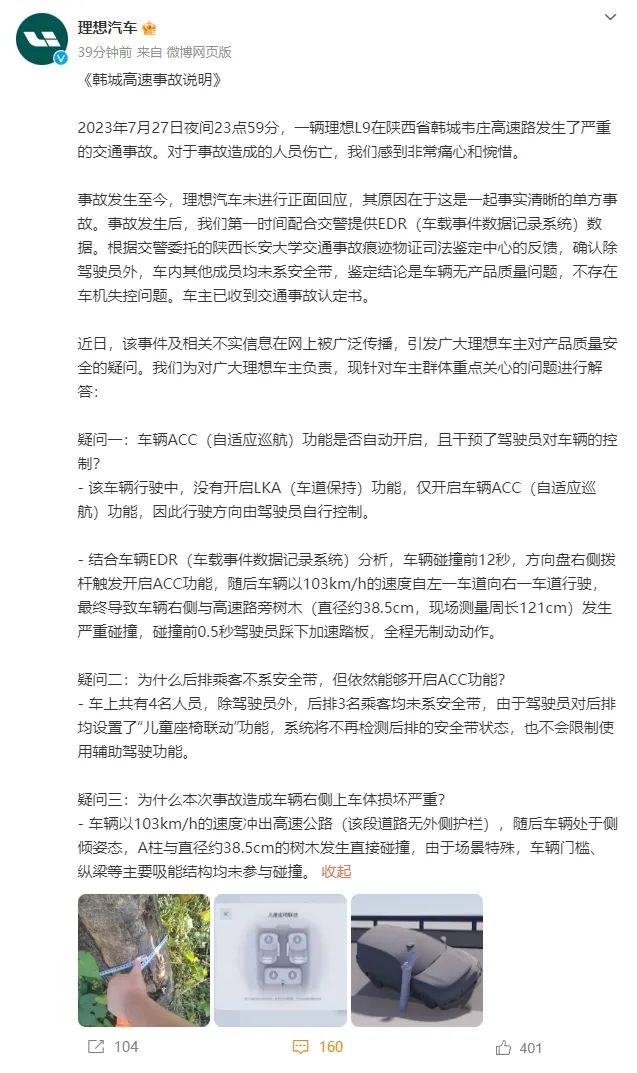 事故起因, 2023 年 7 月 27 日夜间 23 点 59 分,一辆理想 L9 在陕西省韩城韦庄高速路发生交通事故,造成导致一死三伤。