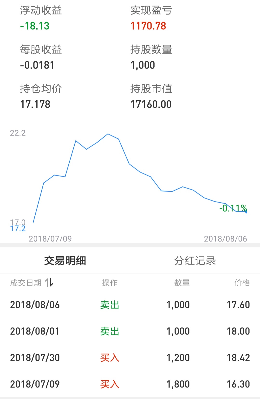 还好我跑得快。上周18块抛了1000股,上午17.6又抛了1000股。现在只剩1000股,随便他涨跌。