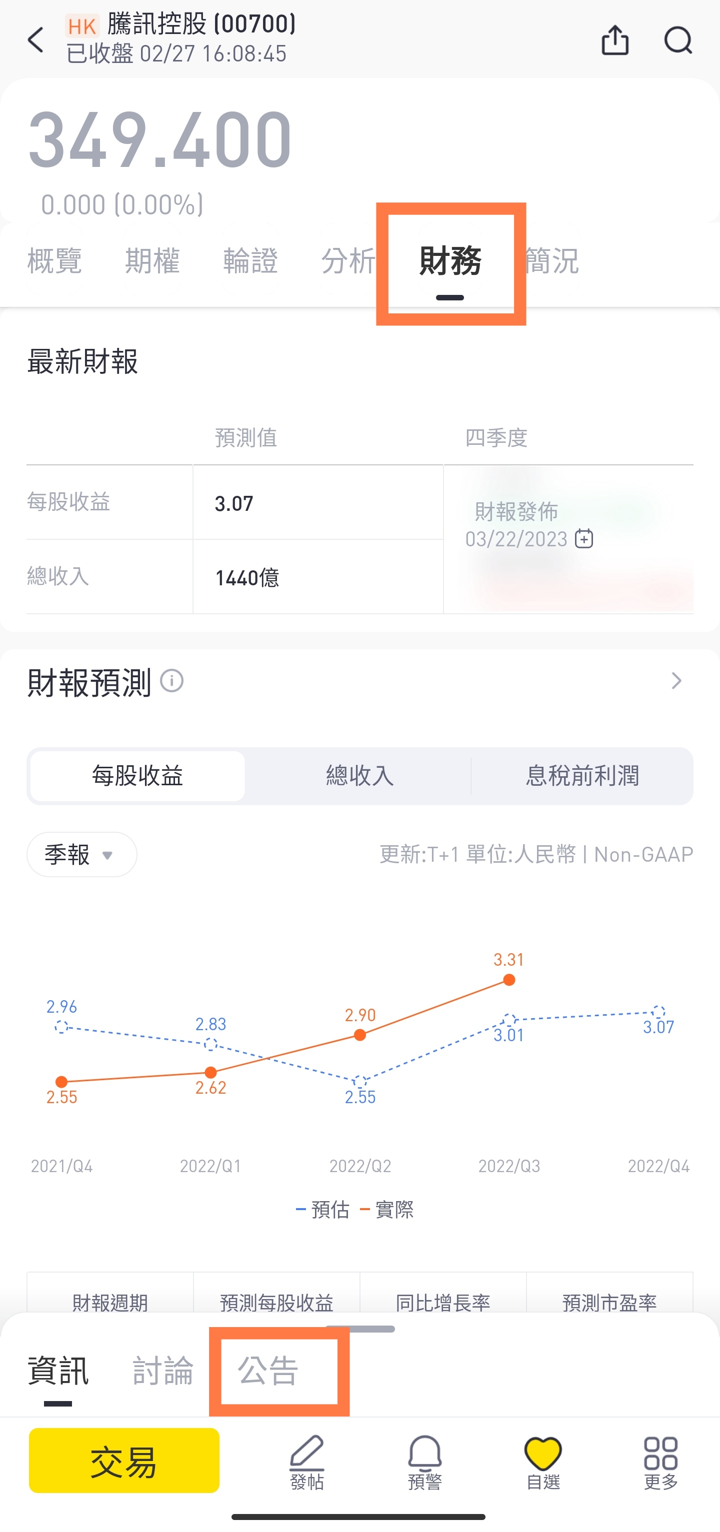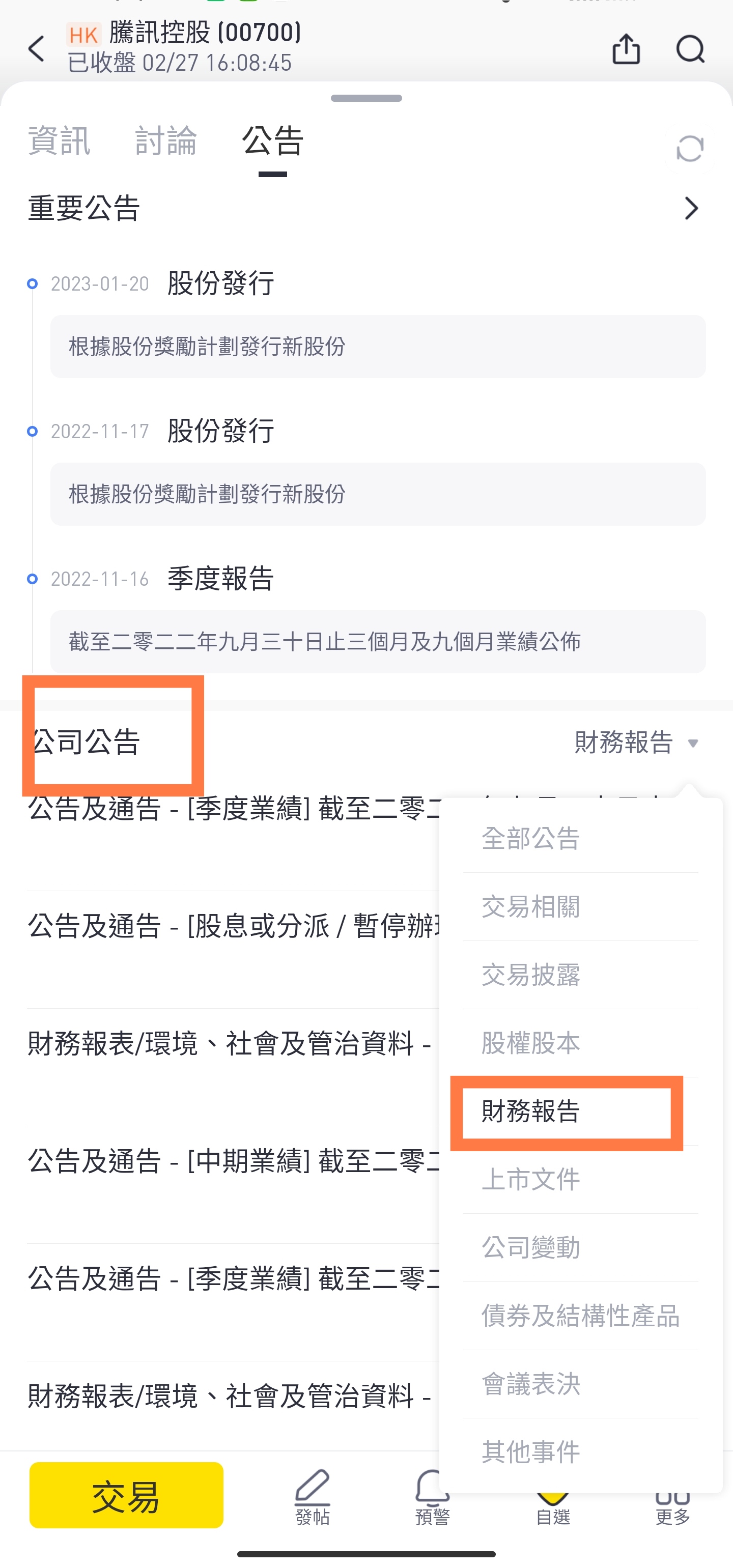 (2)点击“腾讯控股”,点击“财务”,点击下方“公告”。