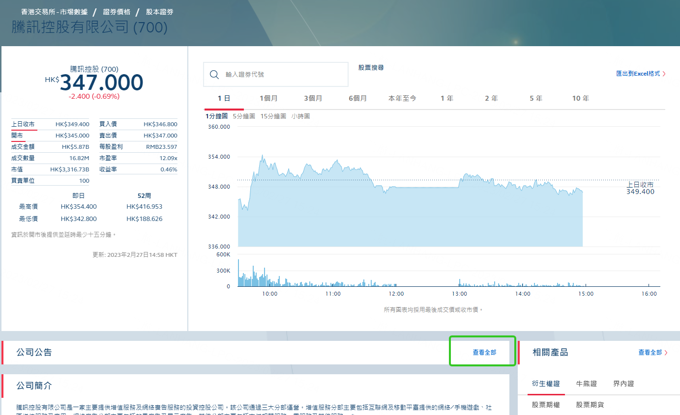 (2)点击“腾讯控股”,进入市场数据界面。点击右下角“查看全部”,进入公告界面。