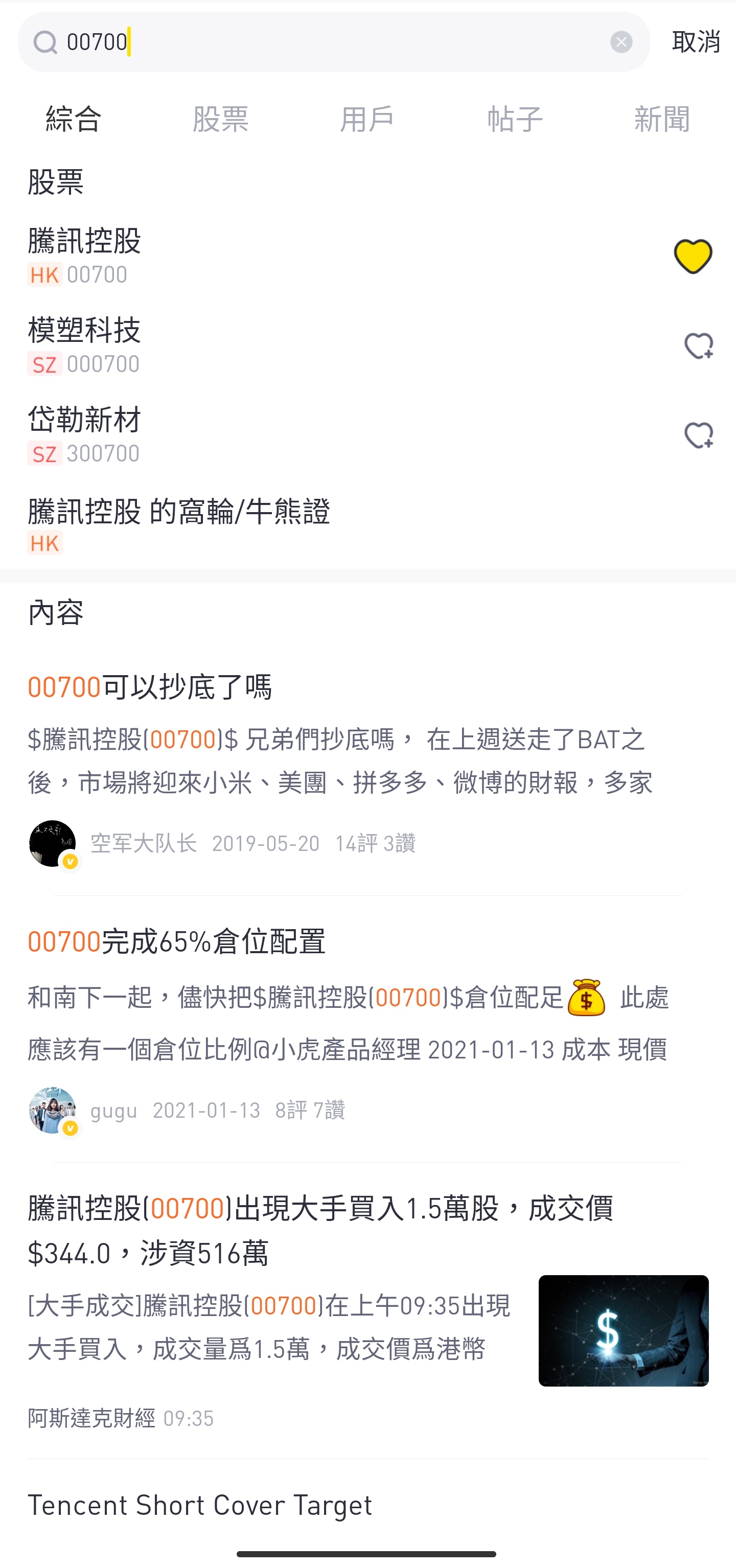 (1)打开Tiger trade app,在首页搜索框中输入港股全称或者代码,以腾讯控股(00700.HK) 为例。