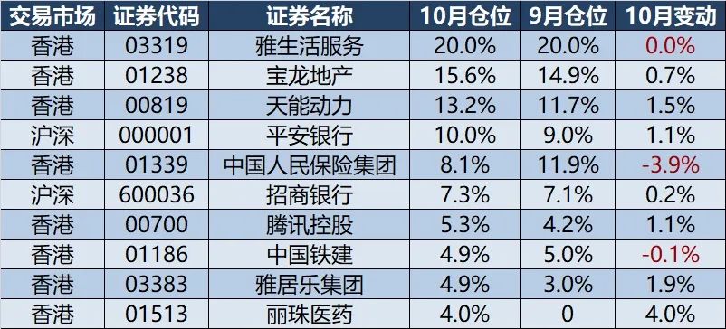 10月主要增持:丽珠医药H、雅居乐集团、中信银行H、天能动力、腾讯控股、平安银行。