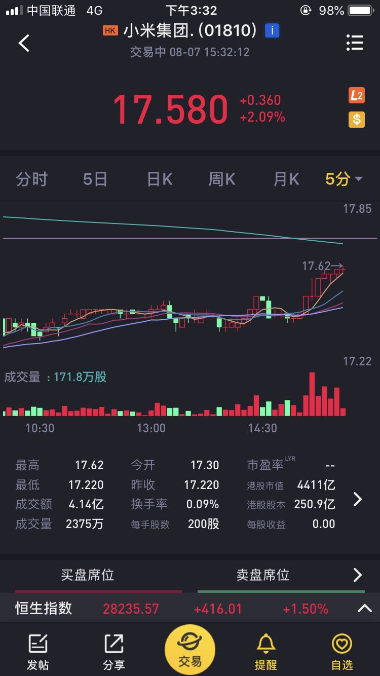 $小米集团-W(01810)$ 验证了中午发的帖子,庄家在吸筹!下跌趋势通道已经突破,趋势暂时已经改变,如没有任何政策和公司利空,。趋势暂时向上!不排除庄稼压盘,但是能有庄稼入场是好事