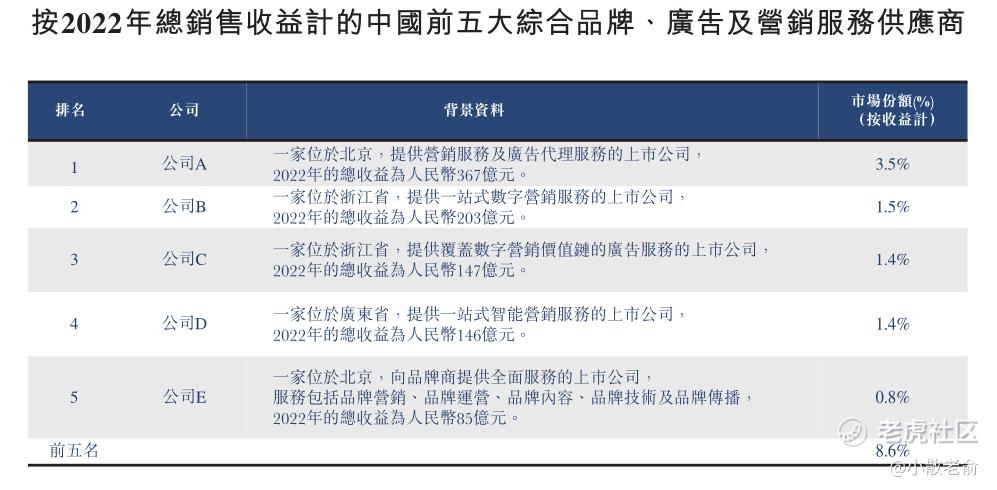 截至2022年12月31日,中国有约190家综合品牌、广告及营销服务供应商。于2021年及2022年,本集团销售收益分别**国综合品牌、广告及营销服务市场总支出的约0.014%及0.02%。