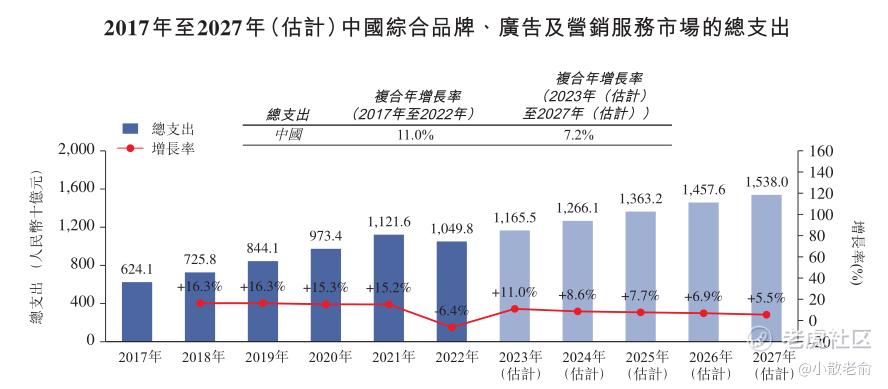 于2017年至2022年,中国综合品牌、广告及营销服务市场的总支出快速增长,由人民币6,241亿元增加至人民币10,498亿元,复合年增长率为11.0%。于2022年,湖北省综合品牌、广告及营销服务的总支出达到约人民币276亿元,约**国总支出的2.6%。预计到2027年年底前将有超过200名参与者,因此,预期中国综合品牌、广告及营销服务市场将保持快速发展,到2027年年底总支出将达到人民币15,380亿元,2023年至2027年的复合年增长率为7.2%。