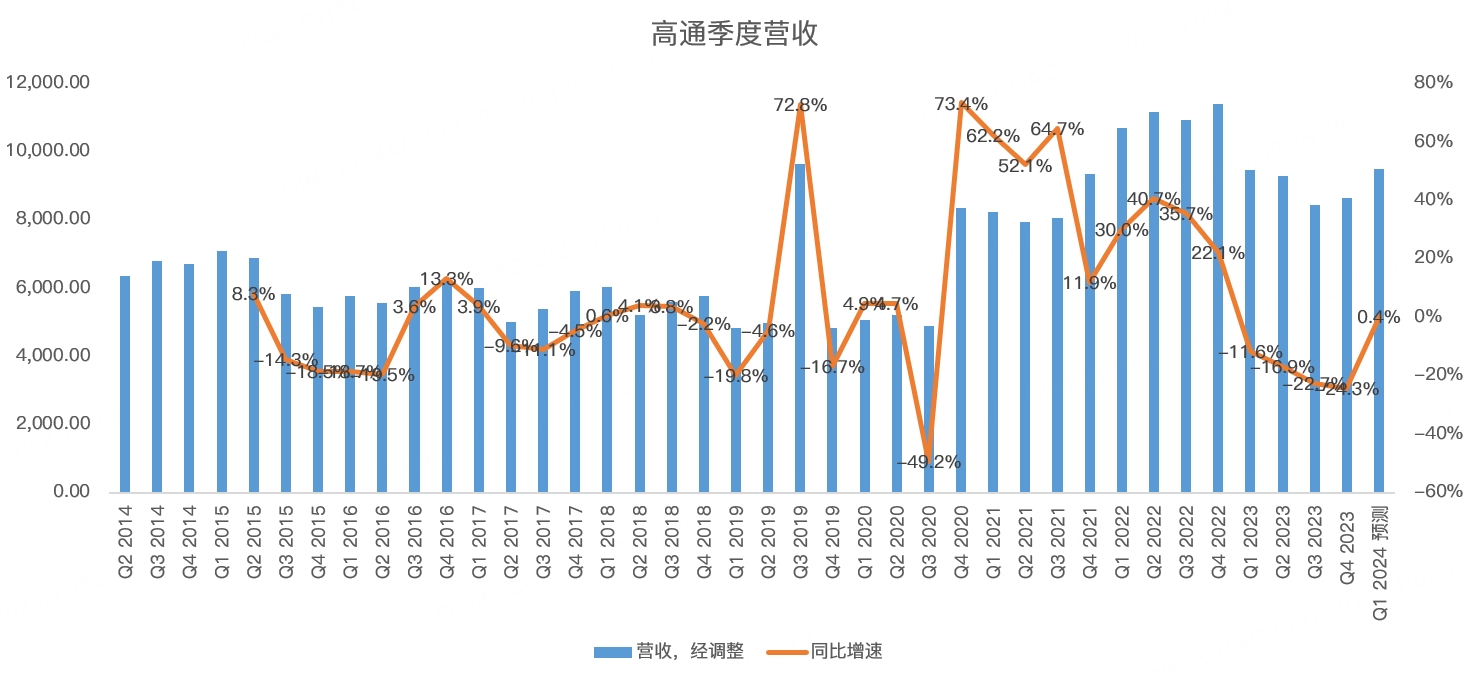 最劲爆的消息是高通预计下一季营收在91-99亿美元之间,取中值95亿计算,同比增速将扭转连续4个季度两位数的下滑,转而增长0.4%,分析师预期92.6亿: