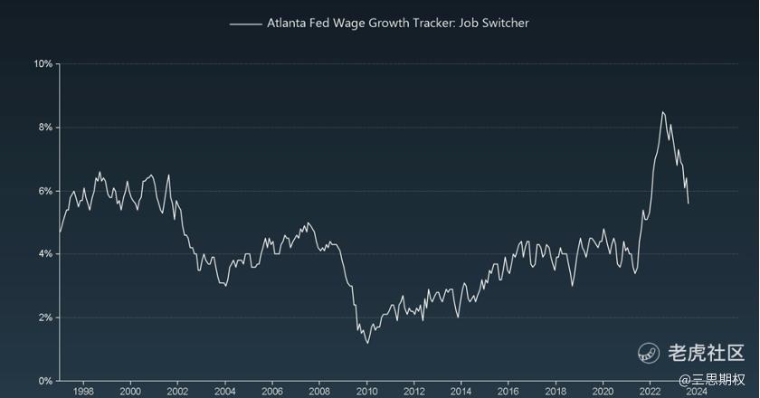 亚特兰大联储的跳槽人士工资调研(下图)也同样证伪了美国的工资通胀粘性:员工在跳槽之后的工资增幅已远不及去年此时。