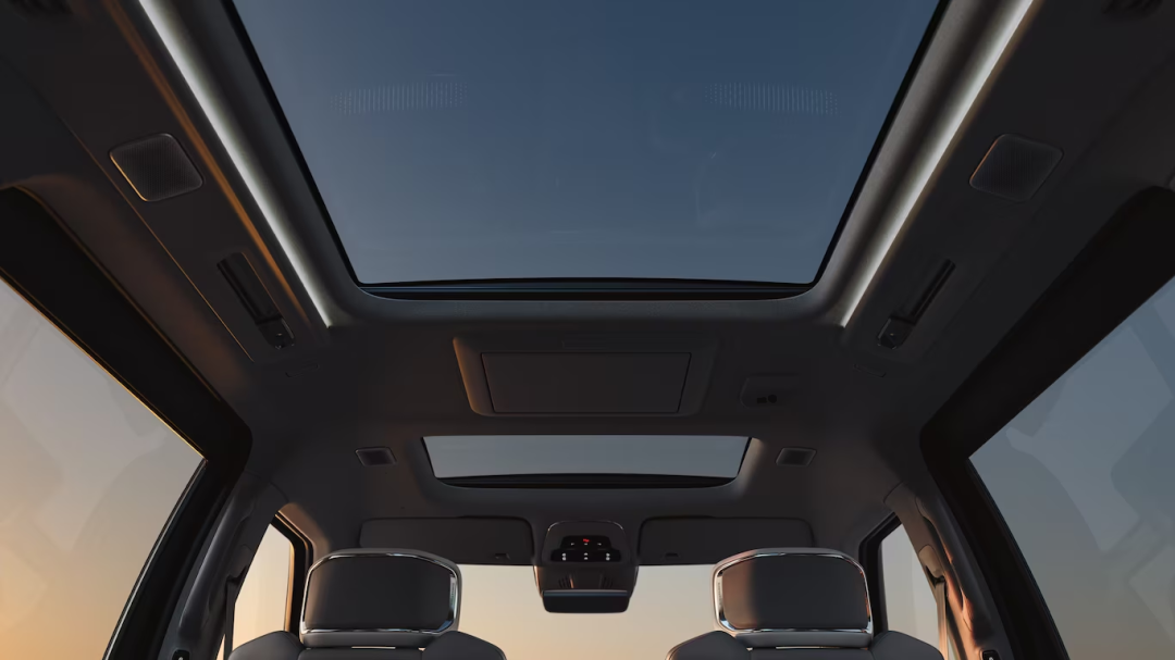 此外,EM90 还设计了一个两段式全景天窗,并配有遮阳帘,天窗照片透露出,其车顶还设有一个吸顶屏,或为极氪 009 同款的 15.6 英寸吸顶屏。