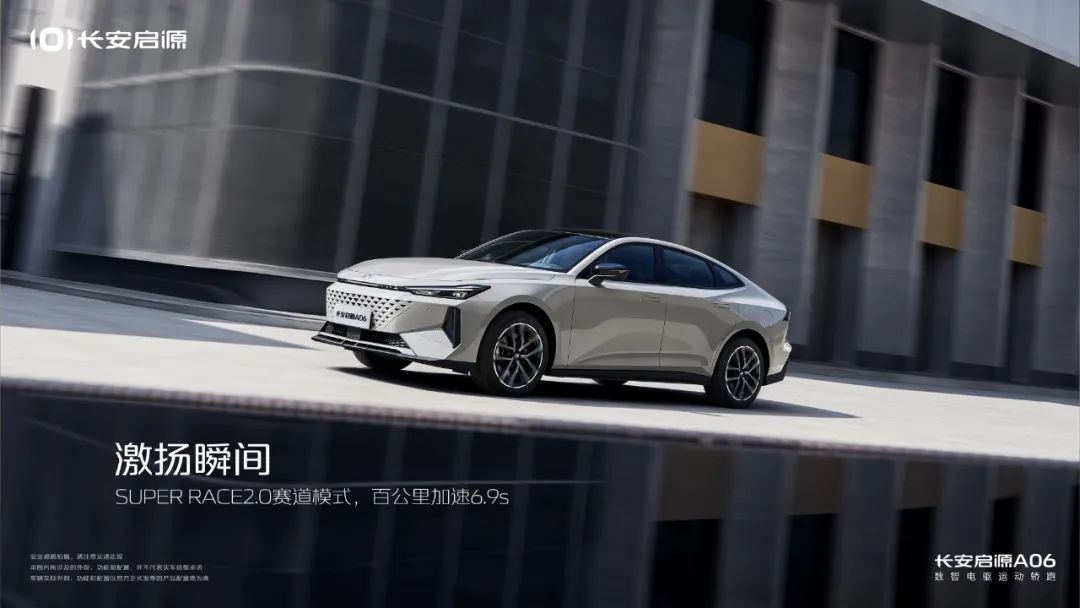 动力方面,启源 A06 用了轿跑专属底盘,支持 SUPER RACE 2.0 赛道模式,零百加速 6.9s,动力形式是插电混动,CLTC 综合续航 1160km,支持 3.3kW 外放电。