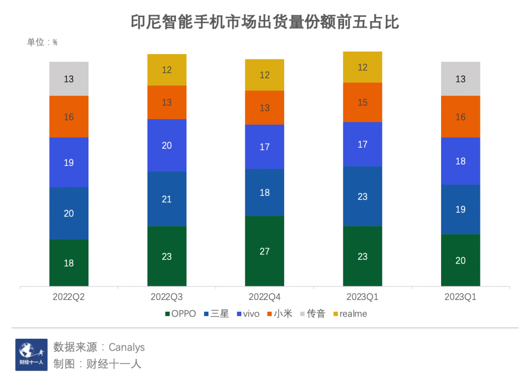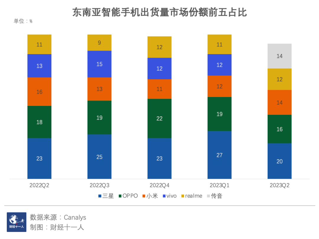 第三方市场调研机构Canalys数据显示,2023年二季度东南亚地区智能手机出货量中,三星以20%排名第一,OPPO(不含一加)以16%排名第二,往后依次是传音、小米和与OPPO同属一个集团的realme。