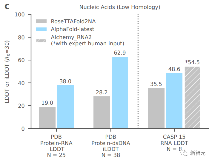 对于构成核糖体等重要细胞组件的蛋白质-核酸复合物结构的预测,AlphaFold-latest的性能明显强于其他模型。