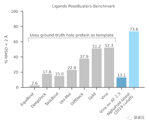 对于复合药物研发的关键部分——配体(Ligand),“AlphaFold-latest”在PoseBusters基准测试中也优于AutoDock Vina等经典模型。