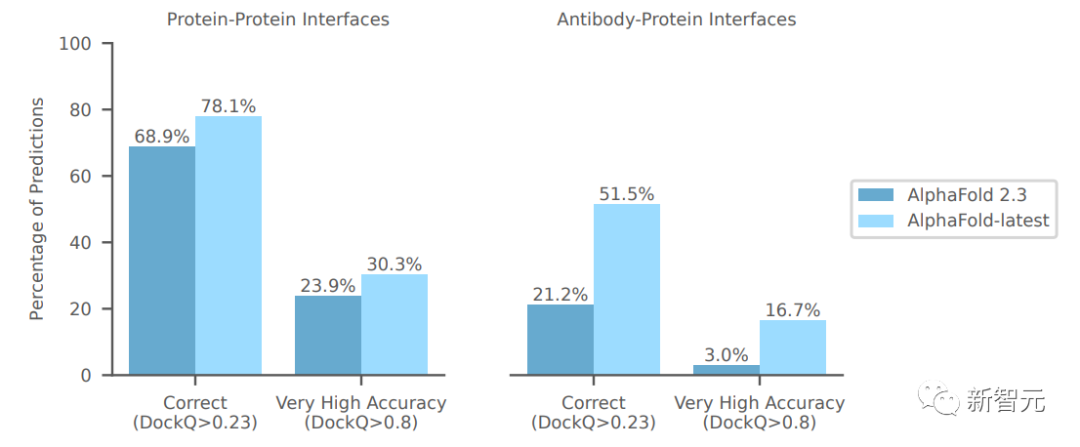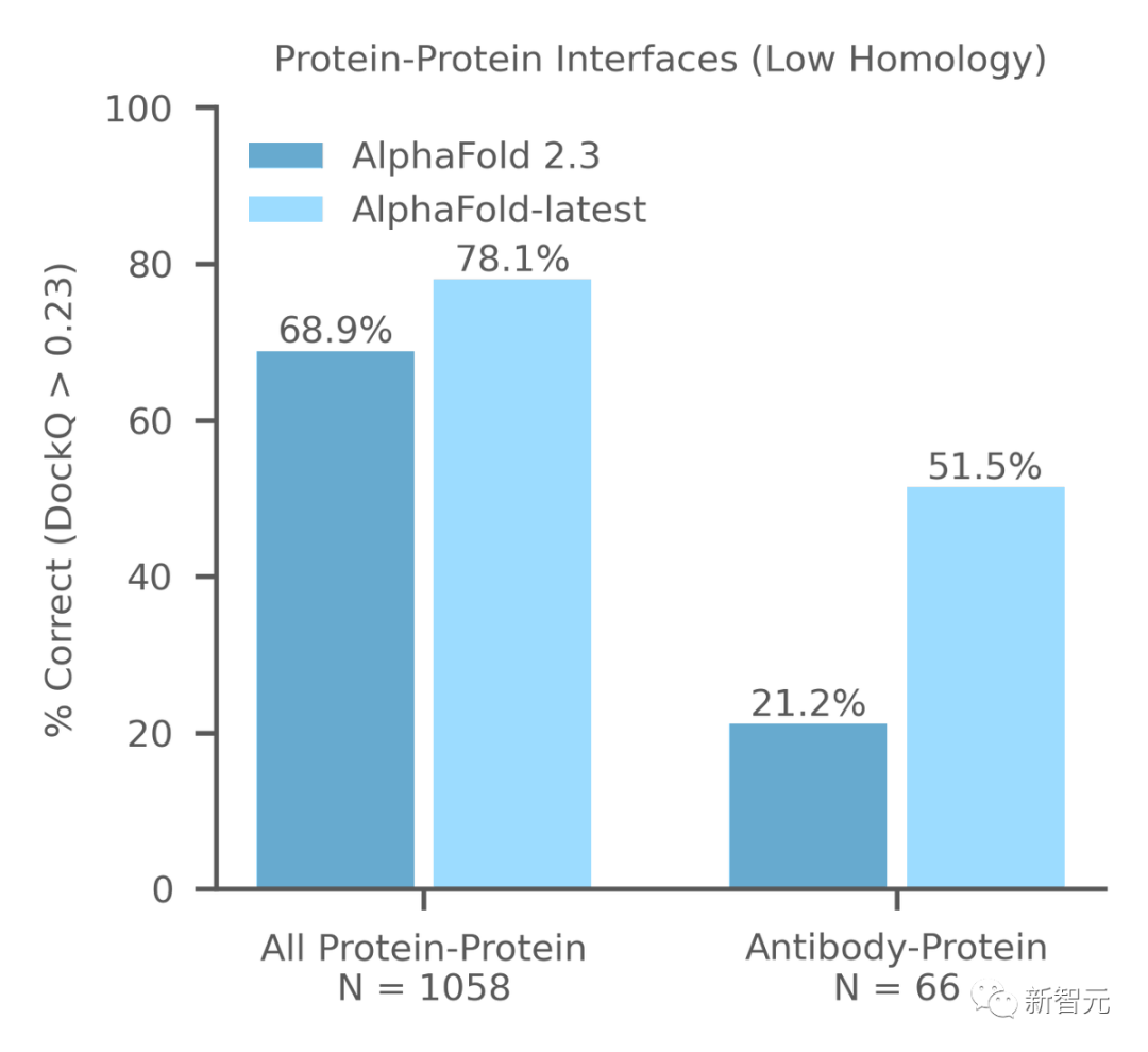 在最近的低同源性PDB评估集上,AlphaFold-latest明显优于AlphaFold 2.3,对于抗体-抗原界面预测的改进更大。