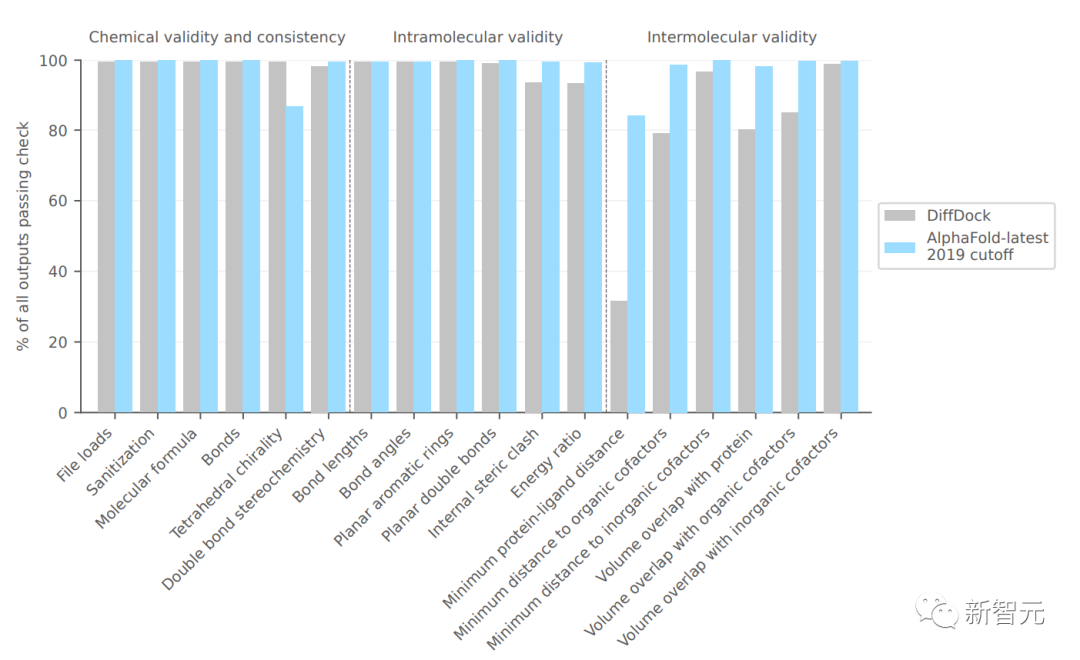 上图比较了PoseBusters工具返回的各种质量检查。请注意,AlphaFold-latest执行的是结构预测,而不是刚性对接,因此它可能会生成具有周围环境中局部变化的预测,以适应配体。