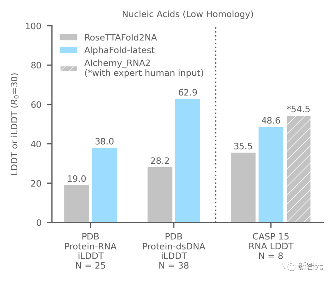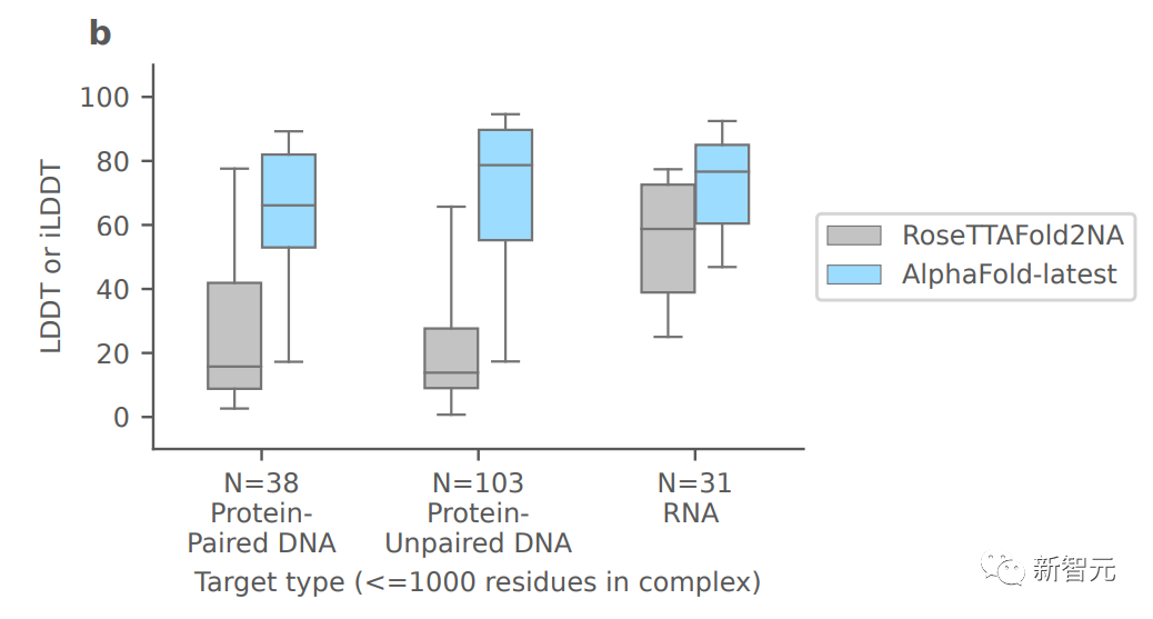 上图展示了将AlphaFold-latest与最近用于一般蛋白质核酸预测的基于深度学习的系统RoseTTAFold2NA(RF2NA)进行比较的结果。