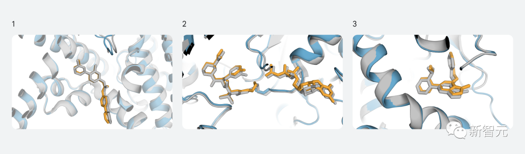 上图显示了三个示例,其中AlphaFold-latest实现了准确的预测,但对接工具Vina和Gold却没有。