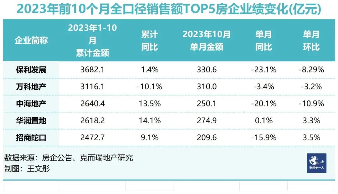 《财经十一人》横向对比了2023年1月-10月,中国房地产销售额前五名企业的情况,确实仅有万科前十个月的累计销量同比呈下降趋势。前五名中只有万科一家为混合所有制企业,其余均为央企背景。