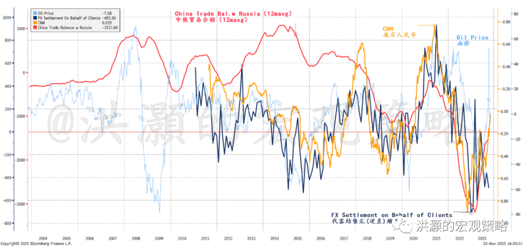 市场认为俄罗斯正在以人民币结算其石油出口,然后换汇补充其美元储备。这般虚虚实实的阴谋论中或许听着似是而非。毕竟,图表6显示,中俄贸易余额与油价、人民币汇率以及中国银行系统的代客结售汇逆差密切相关。