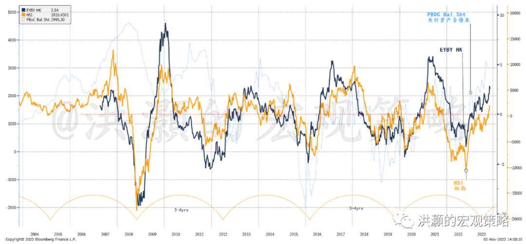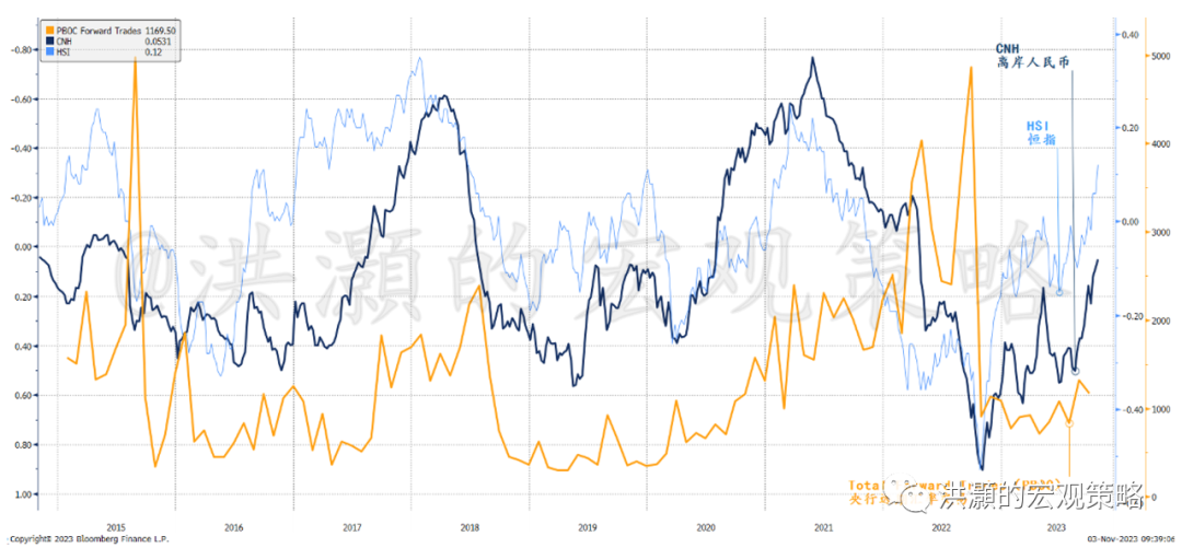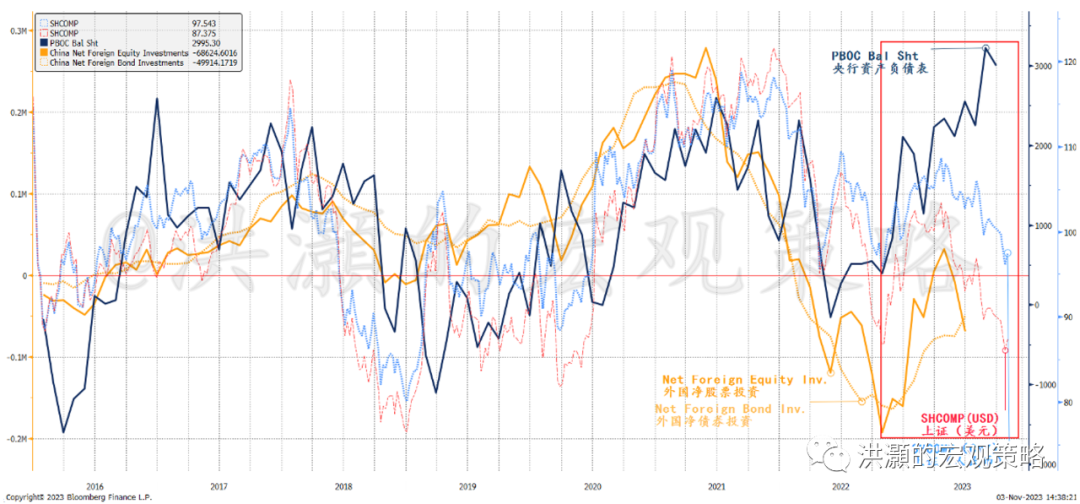 图表4:外资净投资流出正在放缓,并与央行资产负债表的扩张背离。上证亦然。资料来源:彭博,思睿研究。注:外资投资净额为季度数据,更新至2023年6月。