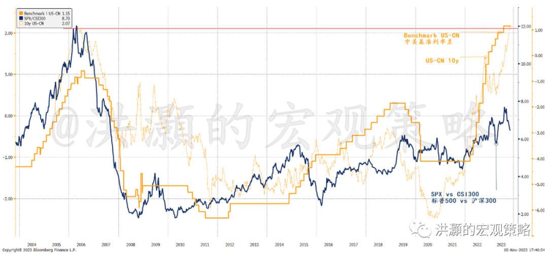我们还可以看到,中美利差和基准利率差与两国股市的相对表现高度相关(图表3)。