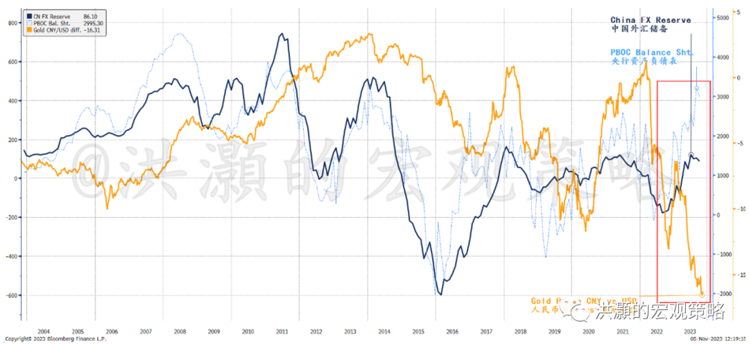 图表9:黄金隐含的人民币贬值预期与央行资产负债表和外储背道而驰。资料来源:彭博,思睿研究