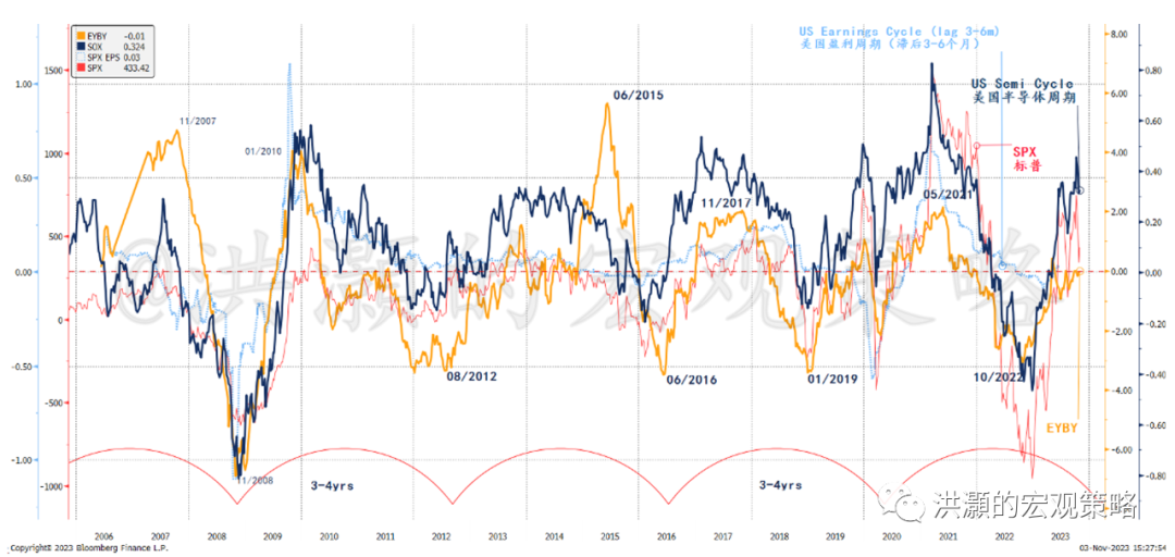 同时,我们另一个专有的美国领先经济指标——美国半导体周期指标似乎也呈现上行态势(图表17)。虽然已盘桓于高位,但若以史为鉴,美国半导体周期的强势可能会持续演绎一段时间,上演与2009年以来的前三轮周期所类似的行情。