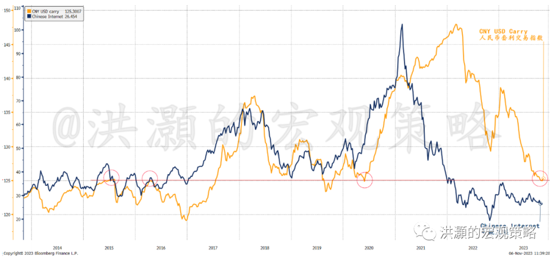 然而,人民币套利交易的回报已降至十年来的最低点(图表11)。在人民币有效实际汇率已触及周期性低点,且美联储正偃旗息鼓甚至可能很快开启降息的情况下,继续进行这种套利交易无异于鱼游沸鼎、鸟覆危巢。即使未来数月中美利差基本按兵不动,人民币汇率走稳和间歇性的汇率升值,会在弹指间令一众套利交易者灰飞烟灭。无独有偶,中概互联网指数也正竭力于十年来的低点附近筑底。