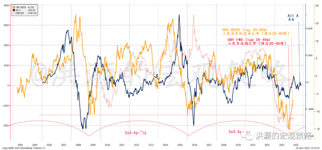 与此同时,人民币远期汇率亦与人民币实际有效汇率同步触底。实际汇率衡量的是人民币的实际购买力,而人民币远期汇率表明市场对人民币走势的隐含预期也正见底。这两种汇率都与中国股市紧密相连,而股市也呈现出波长约3.5年的类似周期(图表8)。