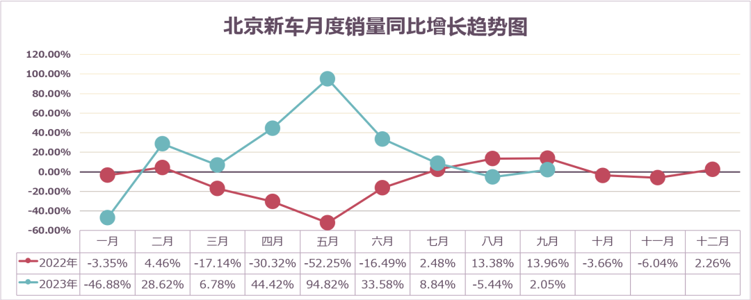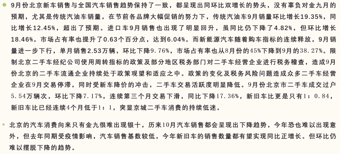 9月份北京新车交易6.61万辆,环比上涨6.23%,环比增幅低于全国4.47个百分点;同比上涨2.05%,同比增幅低于全国7.45个百分点。