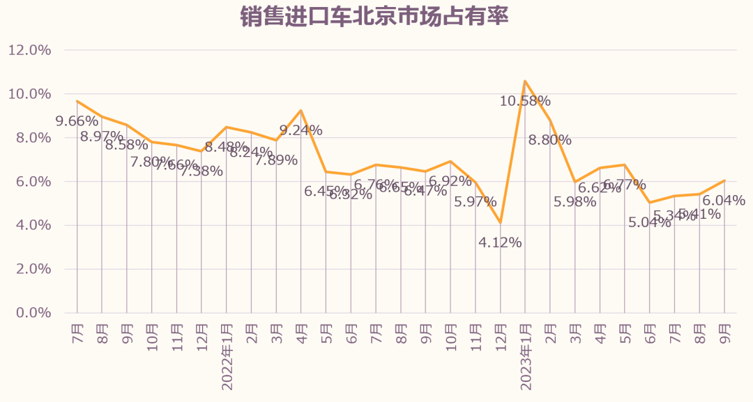 9月北京进口车销量占北京新车交易总量6.04%,占有率环比增长0.63个百分点,同比下降0.43个百分点。