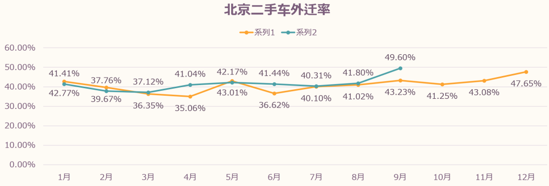 9月份北京二手车交易外迁率为49.6%,外迁率环比上涨7.8个百分点,同比增长6.37个百分点。1-9月北京二手车外迁率为41.27%,累计外迁21.33万辆。