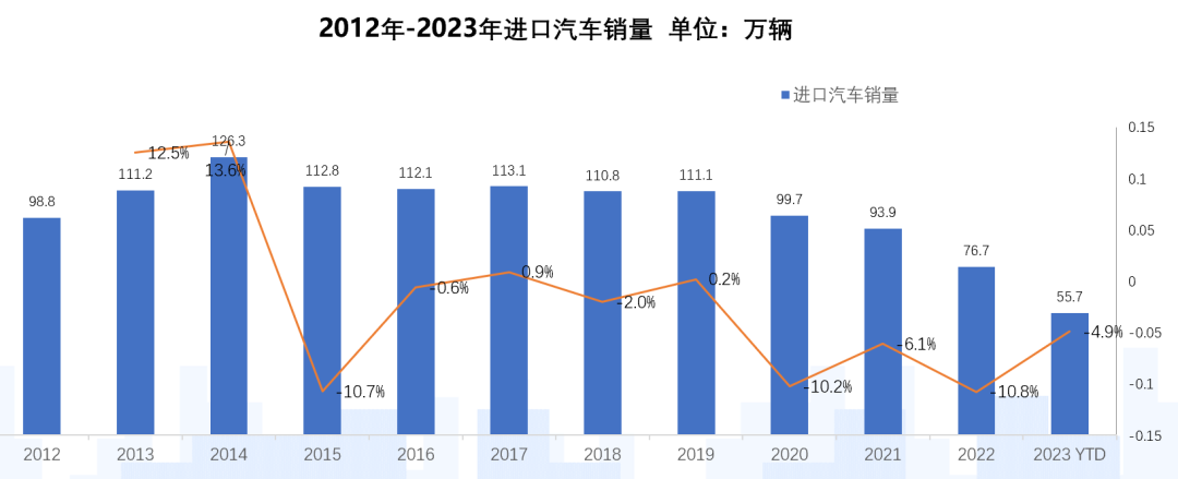 近年来,进口车终端需求保持相对稳定,受疫情和芯片短期冲击,2020-2022年进口汽车市场出现下滑,2023年1-9月累计销售55.7万辆,同比下跌4.9%。