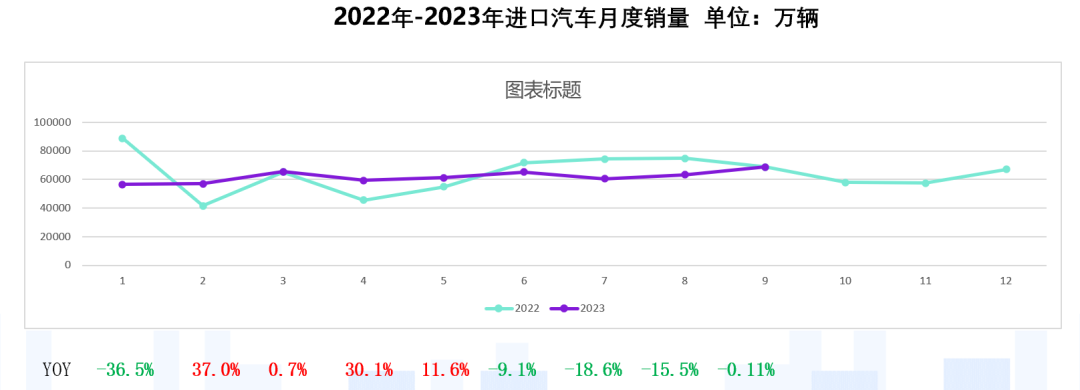 从2022-2023年进口汽车月度销量走势来看,上半年的市场回暖迹象受到阻力,2-4月销量同比均实现增长,2月高增长由于春节因素,4月5月高增长是由于去年基数较低,6月7月8月均受去年高基数影响出现下滑,9月销量基本与去年同期持平。