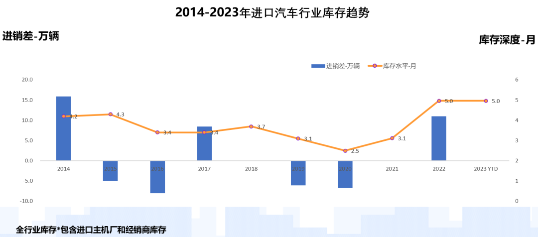 库存:2023年开局如预期进入去库存周期,1-9月进口车供给与需求基本持平,库存绝对量基本不变,库存深度维持在5个月的历史高位。