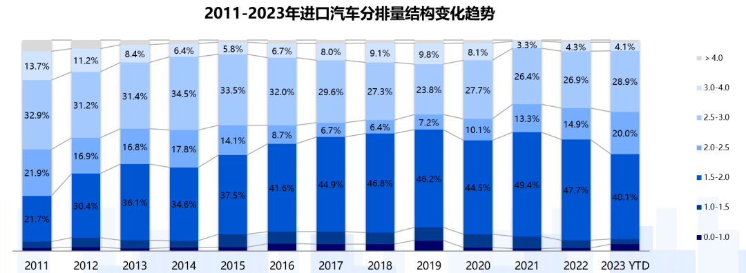 1.5-2.0L排量区间占比下降到40%的边缘,相比2022年下滑7.6个百分点,但仍保持第一大排量区间;2.5-3.0L排量区间占比近三成,相比2022年同期提升2个百分点,是第二大排量区间;2.0-2.5L区间占比达到20%,位居第三。