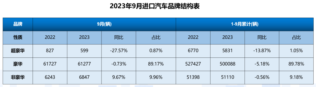 本月超豪华车和豪华车市场仍呈现出不同程度的下降。超豪华汽车本月销量同比下降27.57%,1-9月累计同比下降13.87%。本月在“金九银十”的市场促销环境下,非豪华汽车销量同比上涨9.67%,环比上涨25.8%。豪华车仍然是销量主力,1-9月累计占比为89.78%。