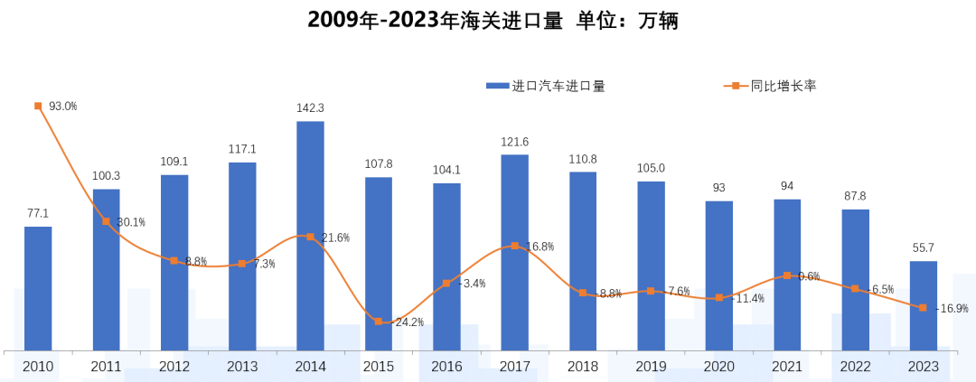 汽车进口量历经三年的下滑后,2022年微下滑,2023年加速下滑,进入“去库存”期,1-9月进口55.7万辆,相比较去年同期下滑16.9%;进口金额达到2695.7亿元,同比下滑12.6%。9月当月进口6.9万辆,同比下降11.5%。