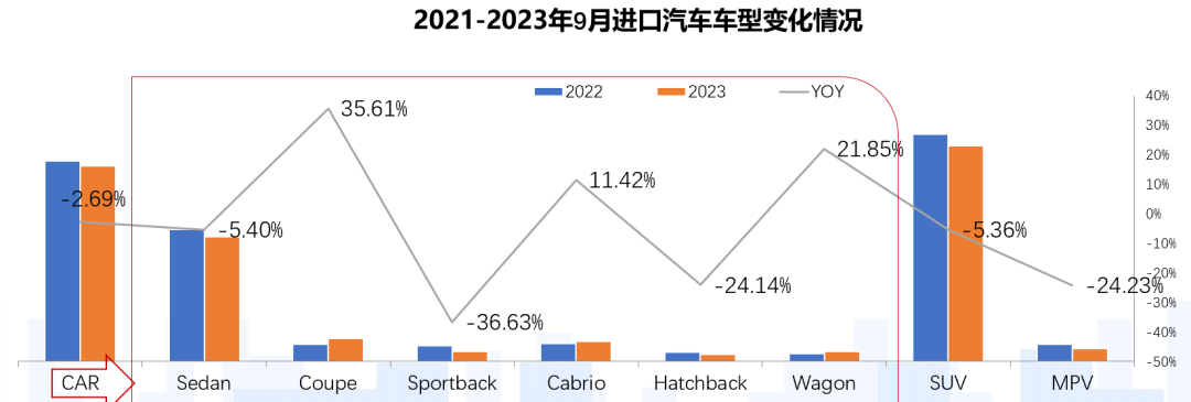 2023年1-9月,三大车型均出现不同程度的下滑,轿车下降2.69%,SUV下降5.36%,MPV的降幅达到24.23%。轿车中的小众车型表现出色,Cabrio、Coupe轿跑、wagon同比分别增长11.42%, 35.61%和21.85%。