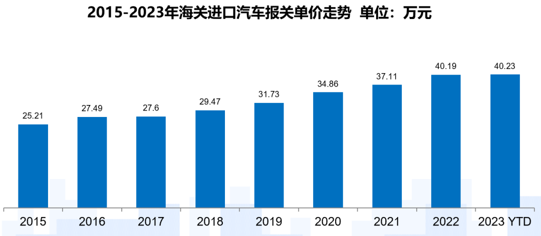 进口汽车报关单价逐年提升,从2015年到2023年,进口汽车报关单价从25.21万元提升到40.23万元,一是消费升级趋势,二是低价产品国产化趋势,三是汇率近期有所贬值。