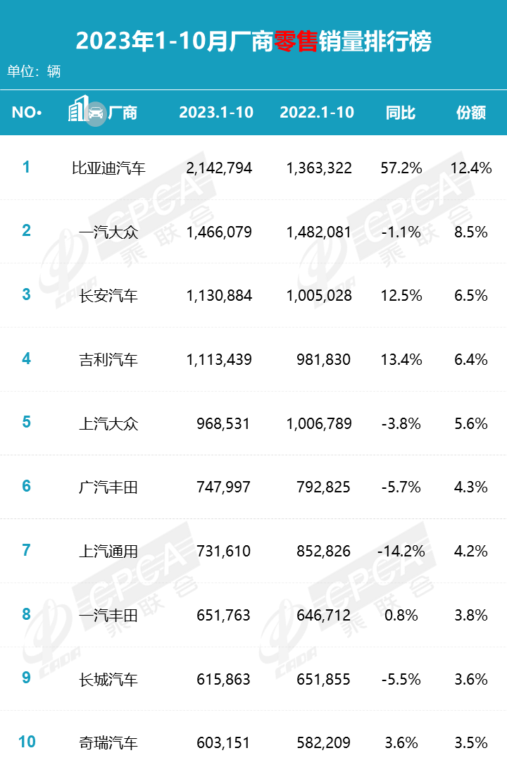 据中国汽车流通协会汽车市场研究分会(乘联会)最新零售销量数据统计,10月份国内狭义乘用车市场零售销量达203.3万辆,同比增长10.2%,环比增长0.7%;1-10月份累计销量1,726.7万辆,同比增长3.2%。