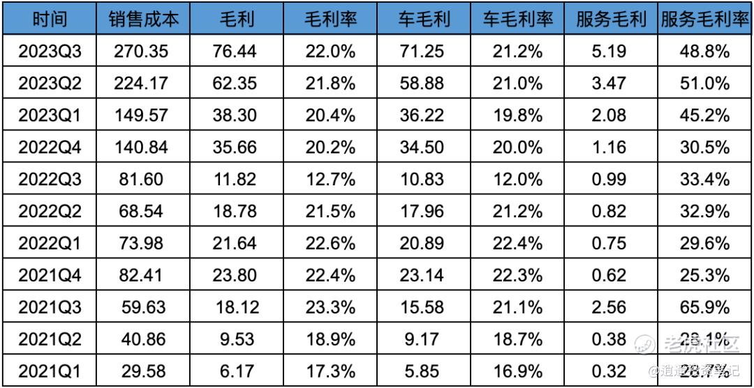 整体毛利76.44亿,整体毛利率22%;车辆毛利71.25亿,车辆毛利率21.2%,略高于Q2。其实很难得,因为Q3有降价补贴,说明规模效应的进一步扩大分摊了成本,使毛利率不跌反升,目前看Q3降价不跌对整体毛利率影响不大。