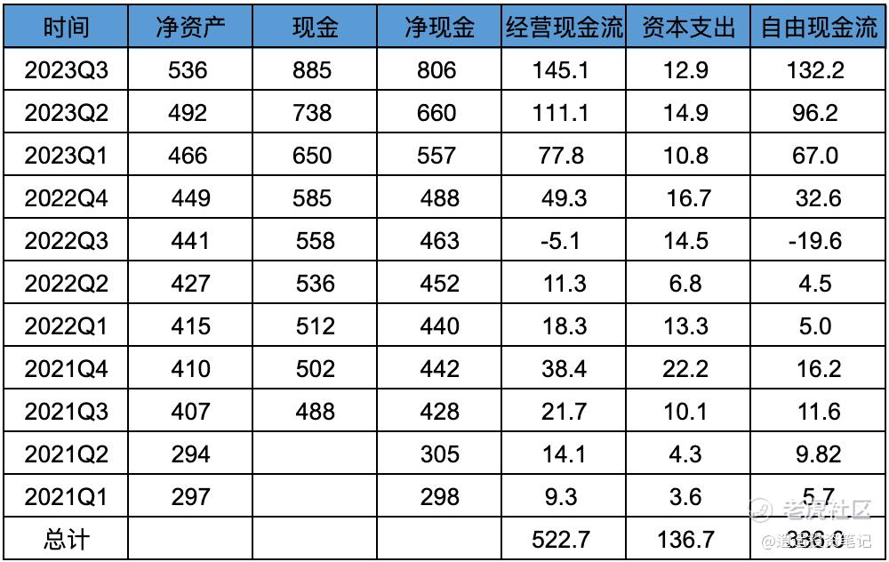 本季度经营现金流145.1亿,资本支出12.9亿,自由现金流132.2亿。前三季度经营现金流334亿,资本支出38.6亿,自由现金流295.4亿。