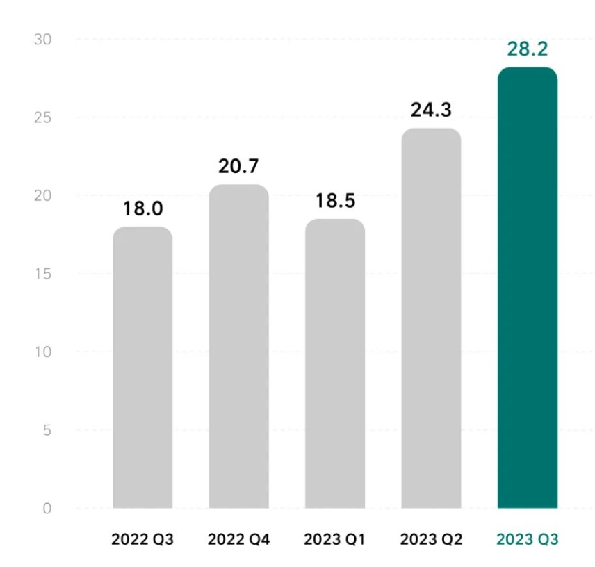 不过,在研发方面,理想继续保持大规模投入,第三季度研发支出28.2亿元,较去年同期的18亿元增加56.1%,较上个季度增加16.1%。